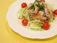 B器にレタス、玉ねぎ、豚肉の順で盛り万能ねぎとミニトマトを飾り、オリーブオイル、バルサミコをかける。お好みで塩、コショウを少々。